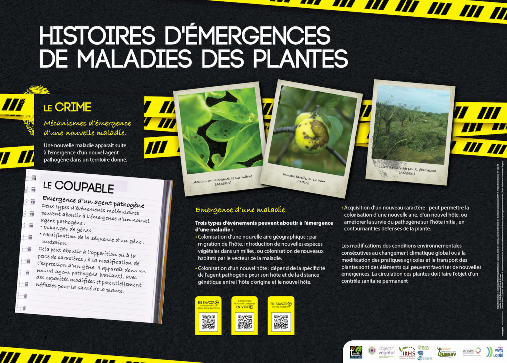 A travers cette exposition réalisée avec des chercheurs en pathologie végétale (INRAE, ANSES), le lecteur mène l’enquête sur ces 3 maladies émergentes introduites en Europe (Xylella fastidiosaPseudomonas syringae pv. actinidiaeVenturia inaequalis et tomato brown rugose fruit virus). Le voyage des plantes, la mondialisation, le changement climatique et les nouvelles pratiques culturales en sont les complices.