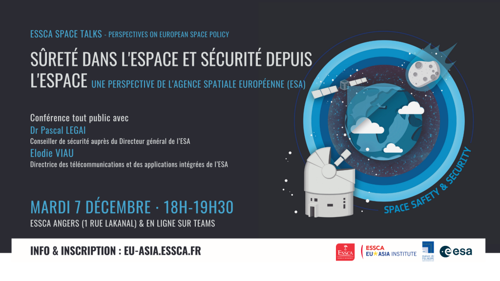 Les ESSCA Space Talks sont nés d’une envie de l’Institut Europe-Asie de l’ESSCA d’ouvrir ses sujets de recherche à un public plus large : l’Europe, les relations internationales, l’innovation à travers les questions de politique spatiale, le développement durable. Devant l’engouement public pour l’espace (Thomas Pesquet, SpaceX, etc.…) et basée sur sa propre expertise, l’Institut a décidé de prendre son envol (jeu de mots que vous avez sans doute vu venir) et d’organiser désormais chaque année un événement grand public autour des questions spatiales. Pour ces premiers ESSCA Space Talks, l’ESSCA a le plaisir d’accueillir Dr Pascal Legai (conseiller en sécurité auprès du directeur général de l’ESA) et l’Angevine Elodie Viau (directrice des télécommunications et des applications intégrées à l’ESA) pour évoquer les enjeux et défis liés à la sûreté dans l’espace et à la sécurité depuis l’espace.