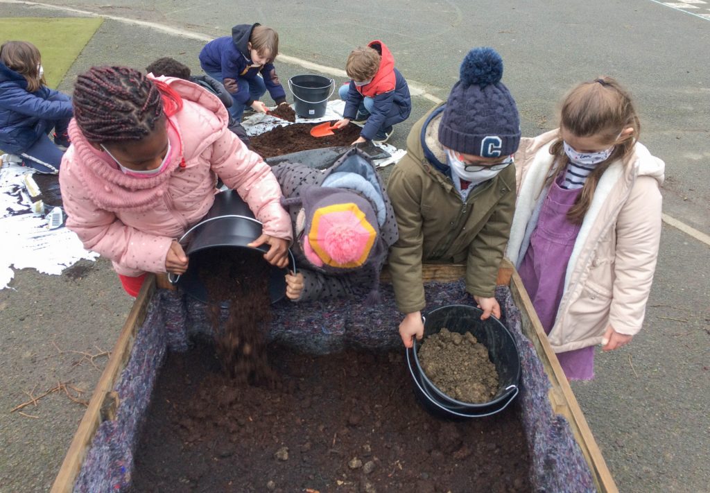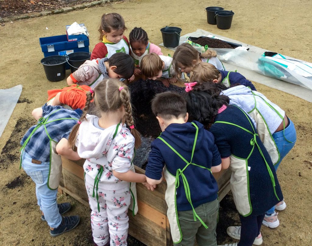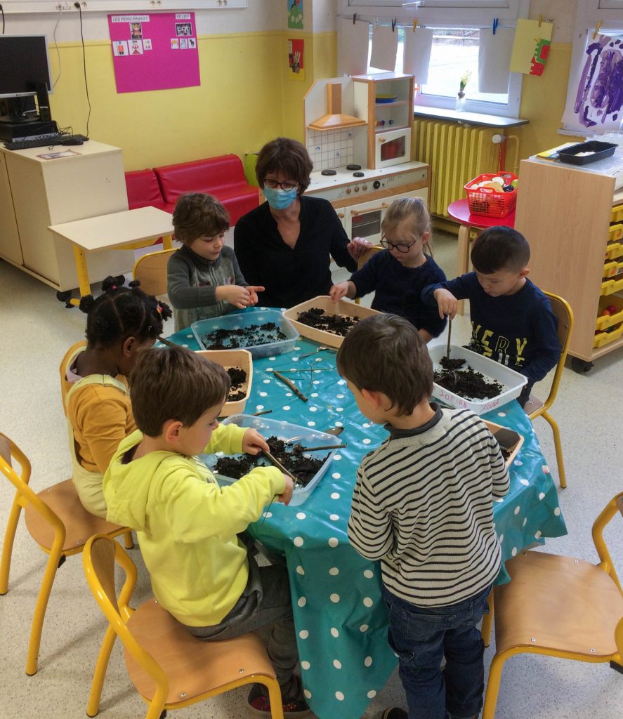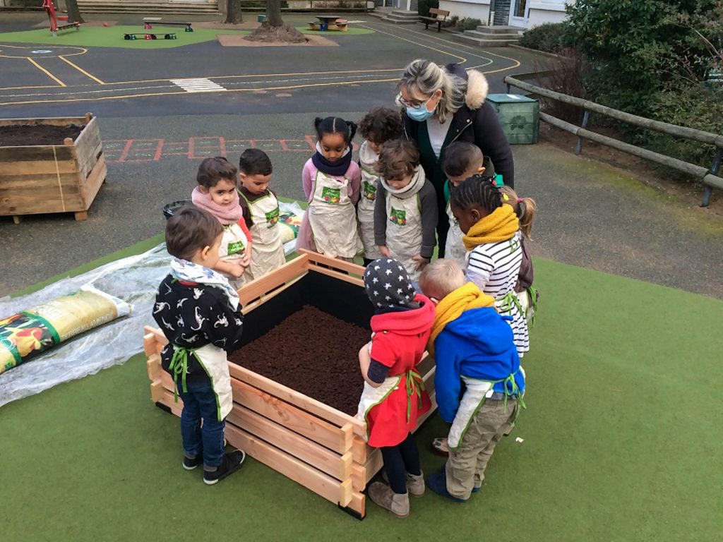 Depuis la rentrée de septembre 2020, accompagnées par une médiatrice de Terre des Sciences, ingénieure horticole, 3 classes de l’école oeuvrent ainsi à la mise en place de leur propre potager au coeur de l’école, répartis sur 4 espaces. En parallèle, chaque classe a pu vivre une série d’interventions sur le végétal, les petites bêtes du sol et les plantes du potager.