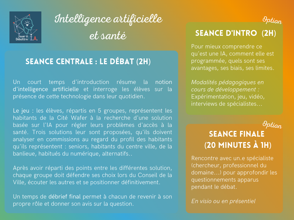 Selon le sujet, un parcours plus complet pourra être proposé, incluant au moins une rencontre avec un.e scientifique ou un professionnel du secteur concerné (ex : professionnel de santé), ainsi qu’une séance introductive pour permettre aux élèves de mieux comprendre la thématique avant d’aborder le débat.