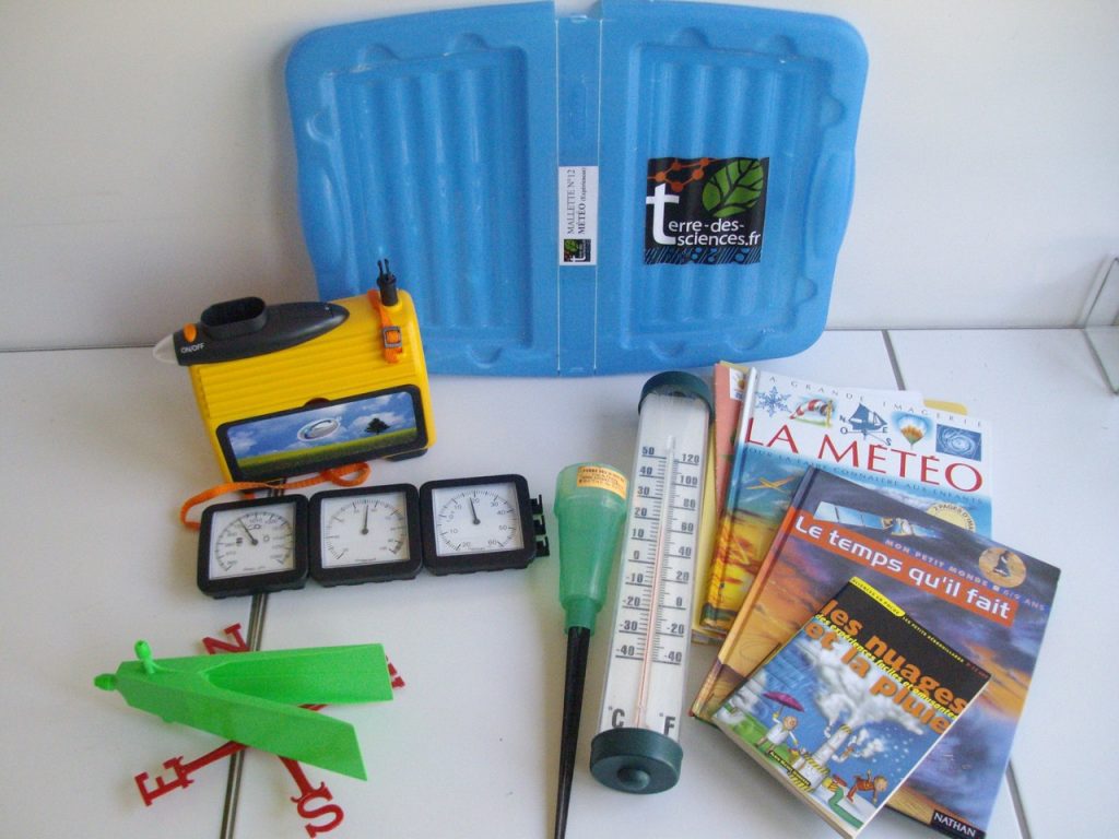 Les outils (thermomètres, girouette, …) sont fournis dans la mallette, mais peuvent aussi être fabriqués par les enfants pendant des séances de technologie.